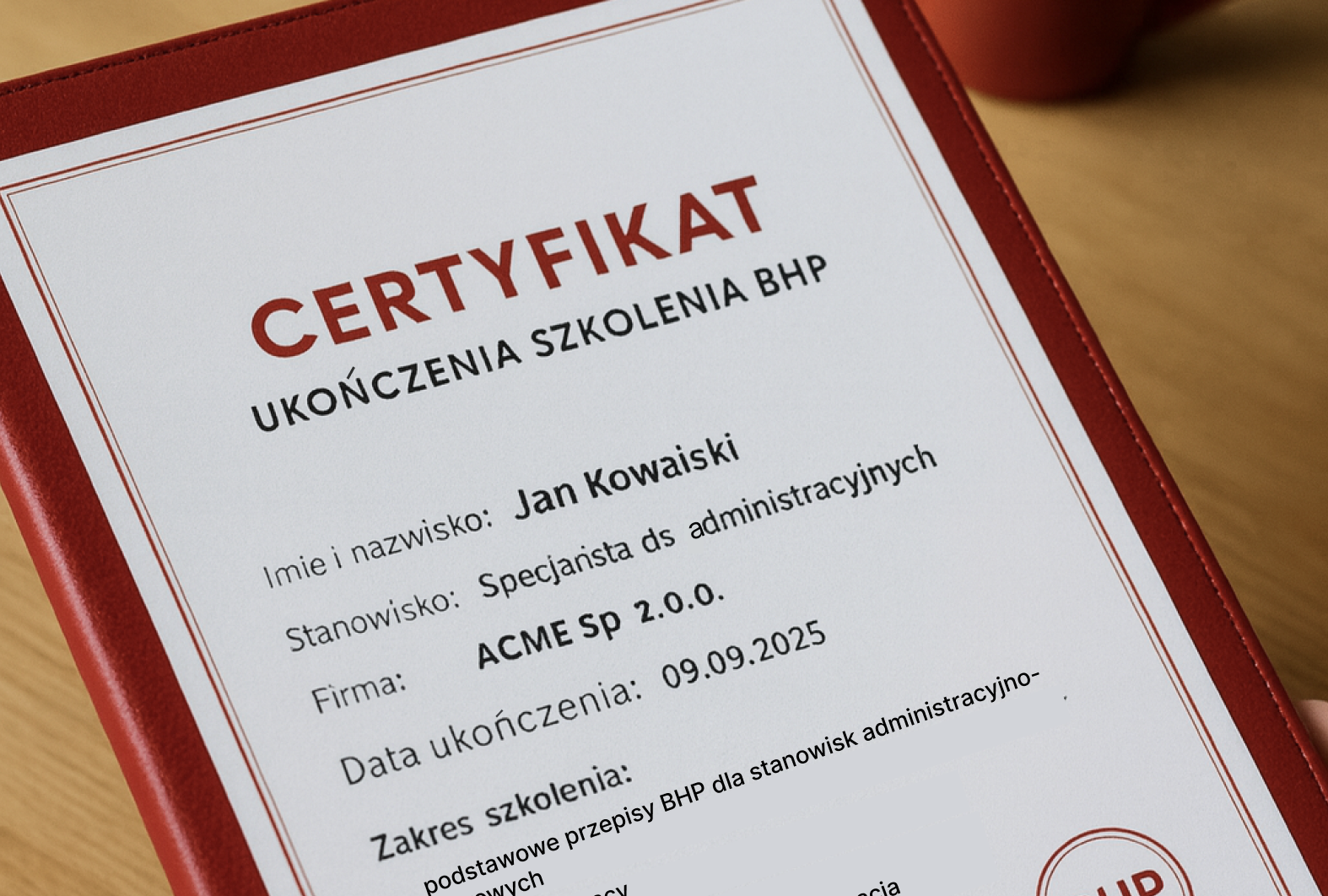 "Certyfikat PDF z podpisem inspektora BHP i zaktualizowane materiały. Kontrola PIP przeszła bez pytań.”